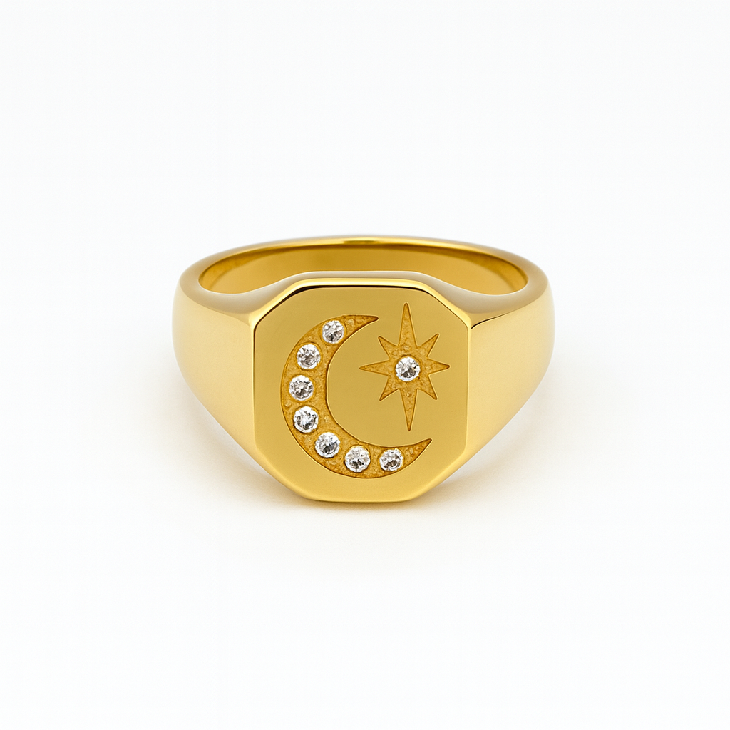 Gold Moon Star Zircon Celestial Signet Ring