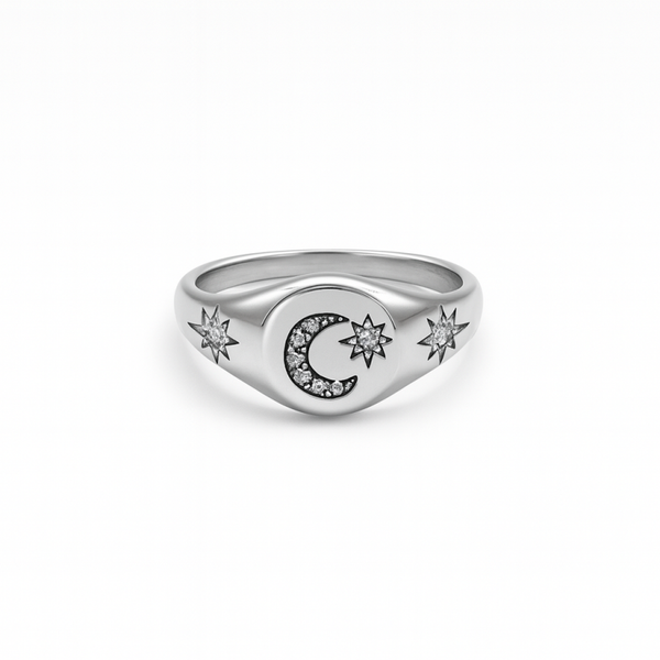 Gold Silver Moon Star Celestial Zircon Signet Ring
